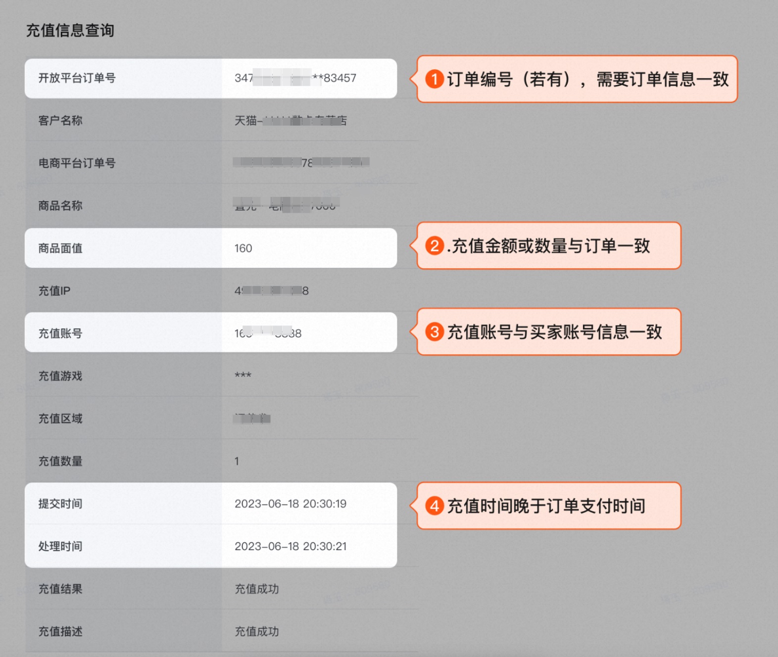 4. 兑换/充值金额与订单金额一致(如消费者申请原因为充值金额不一致才需核实本条信息);
