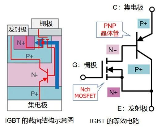 为了更直观地理解IGBT的内部结构和工作原理,我们可以参考下图的IGBT半导体结构示意图以及对应的等效电路图。图中,蓝色箭头(->)表示集电极电流IC的流动方向,我们可以将其与旁边的等效电路图进行对比,以更深入地理解IGBT的工作原理。
