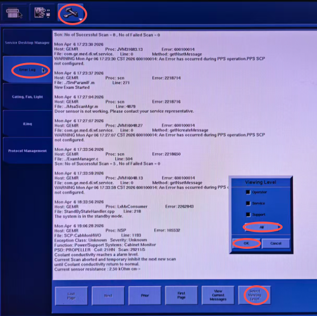 在点击Tool Chest图标,选Error Log>View Log>Select Viewing Level>ALL>OK